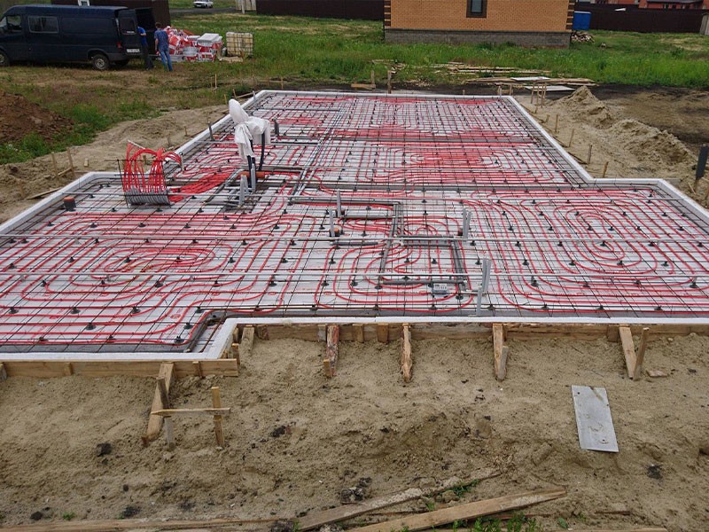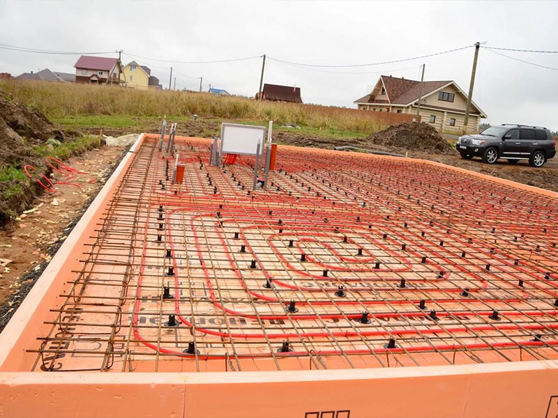 Используем слой утеплителя минимум 10 см. Сразу же прокладываем электрическую систему теплого пола, что делает дом очень теплым. Поверх фундамента можно сразу же монтировать чистовой пол.